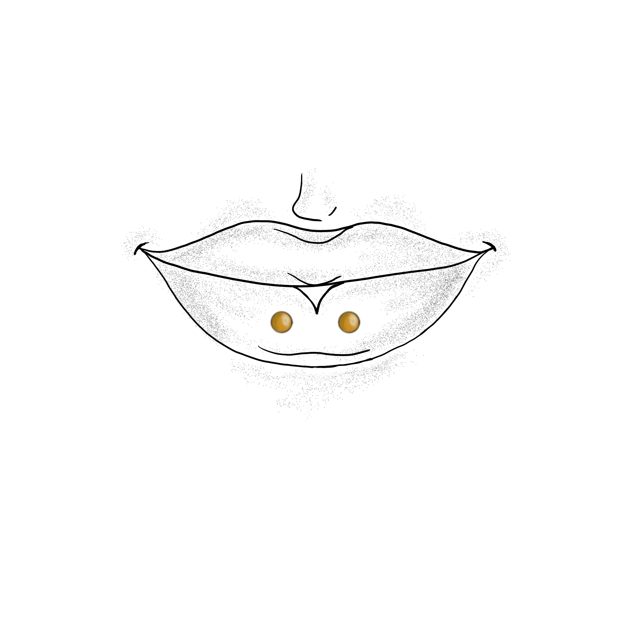 Das Eskimo-Piercing wird vertikal durch die Unterlippe gestochen, wobei die obere Kugel auf der Lippe und die untere unterhalb der Lippe sichtbar ist.