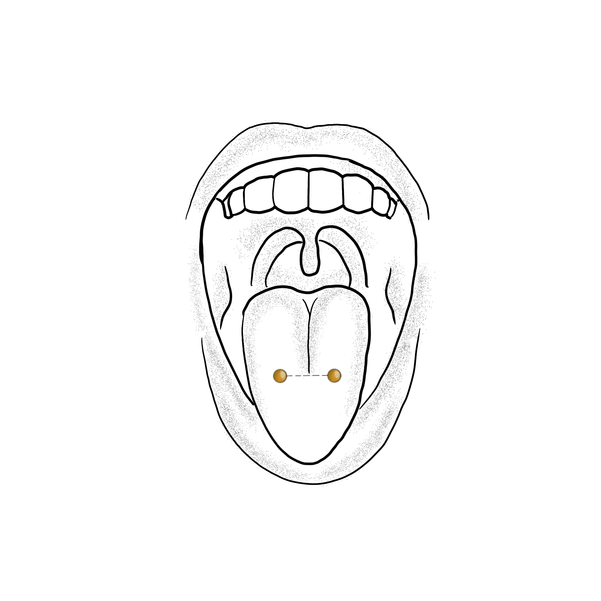 Das Piercing wird mit einer sterilen Nadel horizontal durch die Zungenspitze gestochen. Ein spezieller horizontaler Barbell dient als Anfangsschmuck.